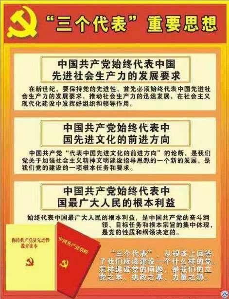 “三个代表”重要思想,即中国共产党始终代表中国先进生产力的发展要求,代表中国先进文化的前进方向,代表中国最广大人民的根本利益。十三届四中全会以来,以江泽民同志为主要代表的中国共产党人,在建设中国特色社会主义的实践中,加深了对什么是社会主义、怎样建设社会主义和建设什么样的党、怎样建设党的认识,积累了治党治国新的宝贵经验,形成了“三个代表”重要思想。“三个代表”重要思想是对马克思列宁主义、毛泽东思想、邓小平理论的继承和发展,反映了当代世界和中国的发展变化对党和国家工作的新要求,是加强和改进党的建设、推进我国社会主义自我完善和发展的强大理论武器,是中国共产党集体智慧的结晶,是党必须长期坚持的指导思想。始终做到“三个代表”,是我们党的立党之本、执政之基、力量之源。