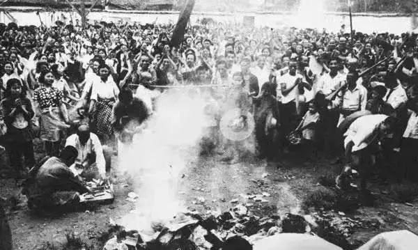 四川省合川县南津乡农民焚烧地主的土地契约书,庆祝土地改革胜利