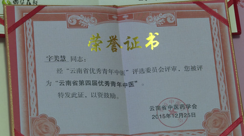 25年如一日的付出,字美慧先后在各级学术刊物发表论文十多篇,其中3篇获得国家级期刊“优秀论文奖”。先后获得“巍山县首届劳动模范”、“大理州五一劳动奖章”、“云南省优秀青年中医”“云南省科技兴乡突出贡献奖”等荣誉。2020年1月,字美慧荣获 “云南省最美中医”荣誉称号。