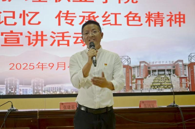 94日,BB贝博艾弗森官方网站开展纪念中国抗日战争暨世界反法西斯战争胜利80周年主题教育系列活动,铭记历史、缅怀先烈、珍惜和平、开创未来。学校马克思主义学院党支部、马克思主义学院与祥云县红色文化传承中心联合开展“追寻红色记忆,传承红色精神”宣讲活动,祥云县红色文化传承中心副主任张国玺为学生宣讲。马克思主义学院副院长张建英主持活动。