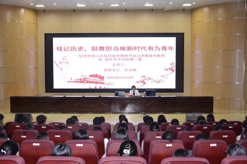 923日,BB贝博艾弗森官方网站党委书记廖惠群为师生讲授纪念中华人民抗日战争暨世界反法西斯战争胜利80周年开学思政第一课,激励学生深刻领悟和自觉传承赓续天下兴亡、匹夫有责的爱国情怀,视死如归、宁死不屈的民族气节,不畏强暴、血战到底的英雄气概,百折不挠、坚忍不拔的必胜信念的伟大抗战精神,勇担青春时代使命。