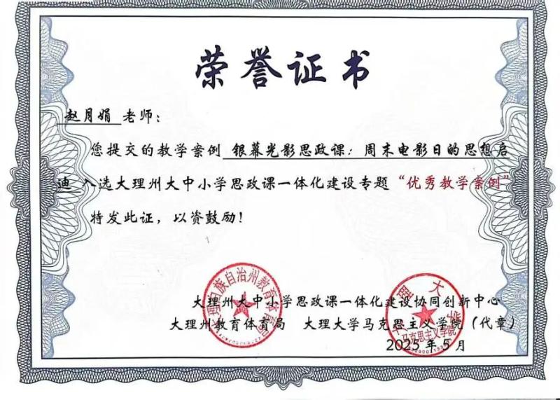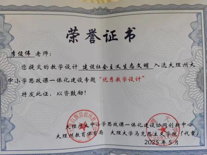 5月,在大理州大中小学思政课一体化建设协同创新中心组织的“大中小学思政课一体化专题教学设计和教学案例评选”中:张建英老师的《弘扬伟大建党精神 自觉担当复兴大任》,张晨、张银老师的《建设社会主义生态文明》,李俊伟老师的《建设社会主义生态文明》入选大理州大中小学思政课一体化建设专题“优秀教学设计”;赵月娟老师的《银幕光影思政课:周末电影日的思想启迪》《继承优良传统 弘扬中国精神》入选大理州大中小学思政课一体化建设专题“优秀教学案例”。