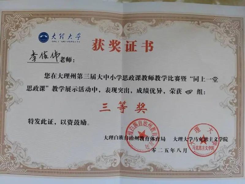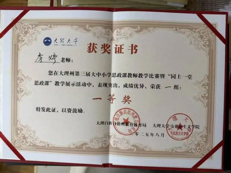 8月,在大理州第三届大中小学思政课教师教学比赛暨“同上一堂思政课”教学展示活动中李婷老师荣获一等奖,李俊伟老师荣获三等奖。