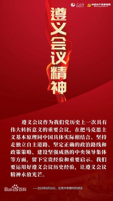 2015年6月,习近平总书记到贵州视察指导,在参观遵义会议会址时强调,遵义会议在把马克思主义基本原理同中国具体实际相结合、坚持走独立自主道路、坚定正确的政治路线和政策策略、建设坚强成熟的中央领导集体等方面,留下宝贵经验和重要启示。我们要运用好遵义会议历史经验,让遵义会议精神永放光芒。在纪念红军长征胜利80周年大会上的重要讲话中,习近平总书记指出:“长征途中,党中央召开的遵义会议,是我们党历史上一个生死攸关的转折点。”回顾那段人类历史上无与伦比的革命壮举,发扬光大遵义会议精神,对于深入学习贯彻习近平总书记系列重要讲话,实现“两个一百年”奋斗目标和中华民族伟大复兴的中国梦,具有重大理论意义和实践意义。