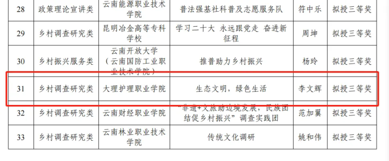 经成果征集、初筛评审、专家复审,贝博官网李文辉同学带领的生态文明引领实践团队提交的2023年“青春百团助百村”云南大学生服务乡村振兴社会实践专项活动成果材料荣获省级三等奖。