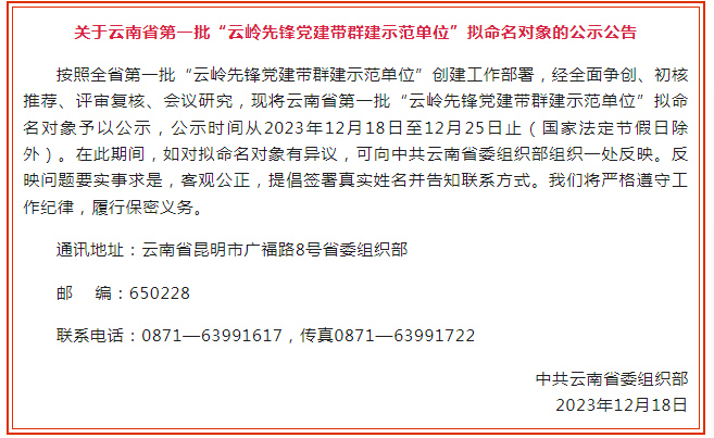 12月18日,云南省委组织部发布云南省第一批“云岭先锋党建带群建示范单位”拟命名对象名单,BB贝博艾弗森官方网站党委入选。