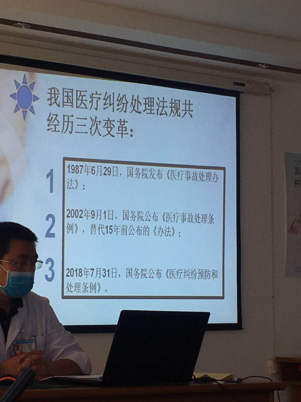 为深入贯彻落实《医疗纠纷预防和处理条例》、《基本医疗卫生与健康促进法》等法律法规,提高门诊部医务人员法律意识,进一步规范医务人员执业行为,提高医疗质量,规避相关法律责任和风险,有效预防和处理医患纠纷,维护和谐有序的诊疗环境。经研究,决定5月28日下午,由门诊党支部牵头,在门诊部召开全体党员、全体职工医疗卫生法律法规培训会。在学习会议上学习了新颁布的《医疗纠纷预防和处理条例》,全体党员、职工共50人参加。