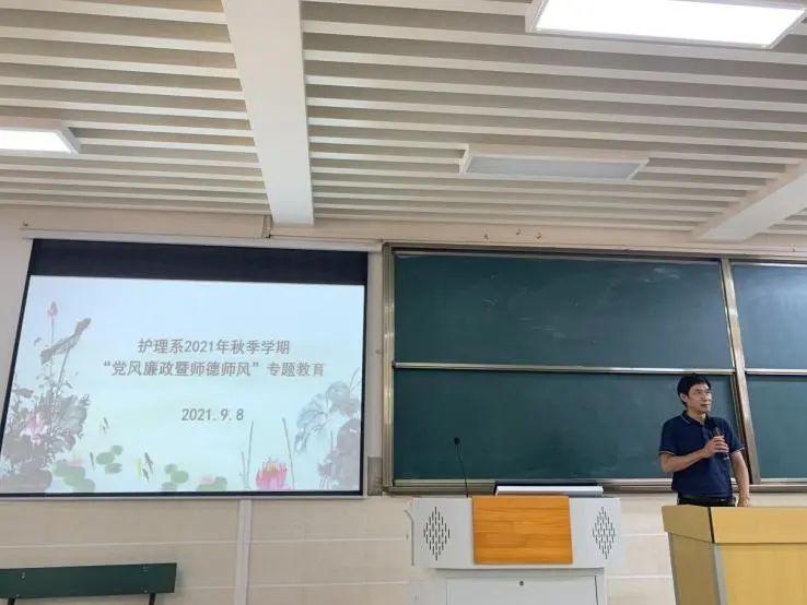为了贯彻落实省教育工委、省教育厅下发的云教工委函〔2021〕4号文件《关于开展师德师风和校园安全专项整治的通知》文件精神。9月8日下午,护理系党支部在第三阶梯教室组织开展了2021年秋季学期“党风廉政暨师德师风”专题教育。学院陈跃祥副院长及护理系全体党员、教学人员、辅导员、班主任参加了此次主题教育专题会。
