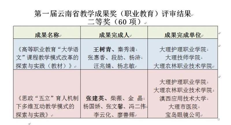 近日,云南省教育厅关于第一届云南省教学成果奖(职业教育)评审结果公示,贝博官网王树青教授主持申报的《高等职业教育“大学语文”课程教学模式改革的探索与实践(教材)》和张建英教授主持申报的《思政“五立”育人机制下多维互动教学模式的探索与实践》均荣获第一届云南省教学成果奖(职业教育)二等奖。