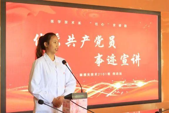 医学技术系团委“红心”宣讲团教师代表沈雅琪讲述了张桂梅同志的先进事迹,学生代表何志远同学分享了身边的榜样人物杨春霞的先进事迹,向全体党员和师生代表传导了榜样的力量,引导师生学好身边人,做好当下事。