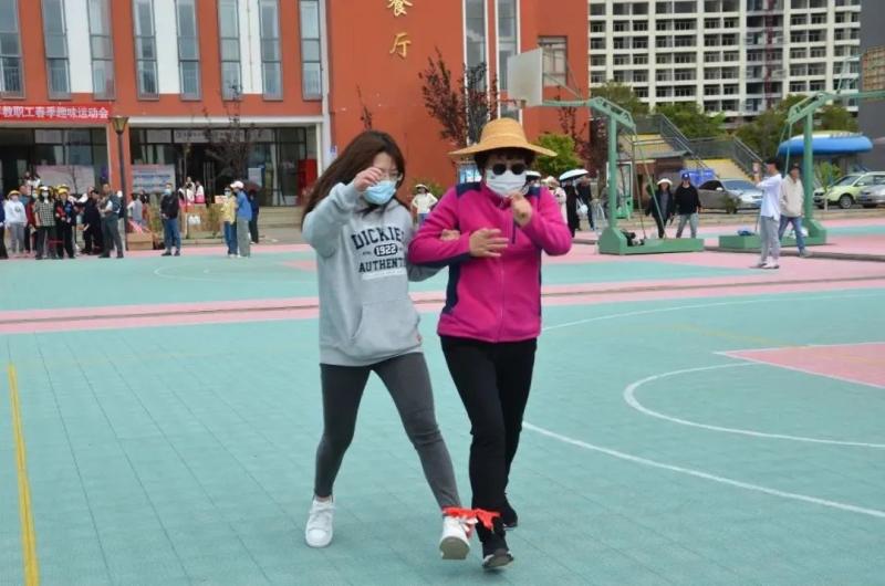运动会设有两人三足跑、接绣球、快乐呼啦圈、瞎子击鼓、趣味保龄球等五个集体项目。全校279位教职工分四个组进行比赛。参赛的运动员使出浑身解数、勇于拼搏,观赛的老师出谋划策、呐喊助威,加油声、欢呼声此起彼伏,整个赛场洋溢着欢声笑语。