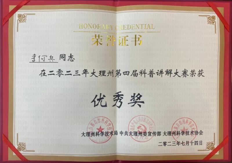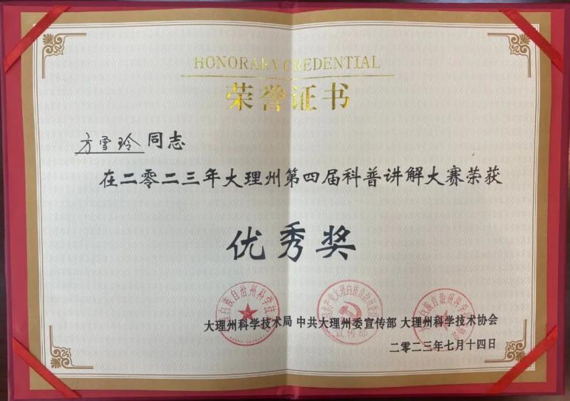 7月14日,BB贝博艾弗森官方网站学生方雪玲、李何兵在大理州第四届科普讲解大赛中荣获优秀奖。