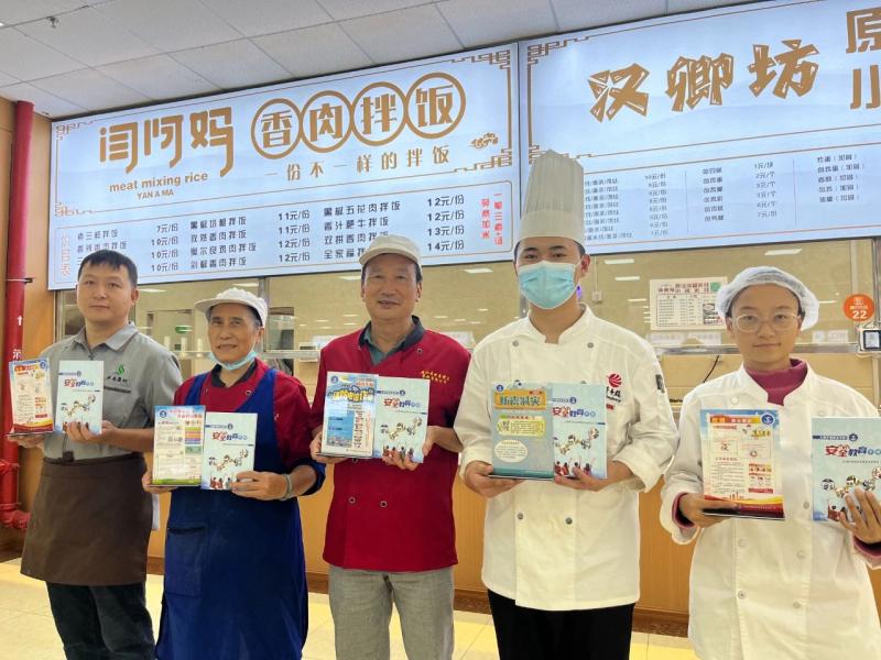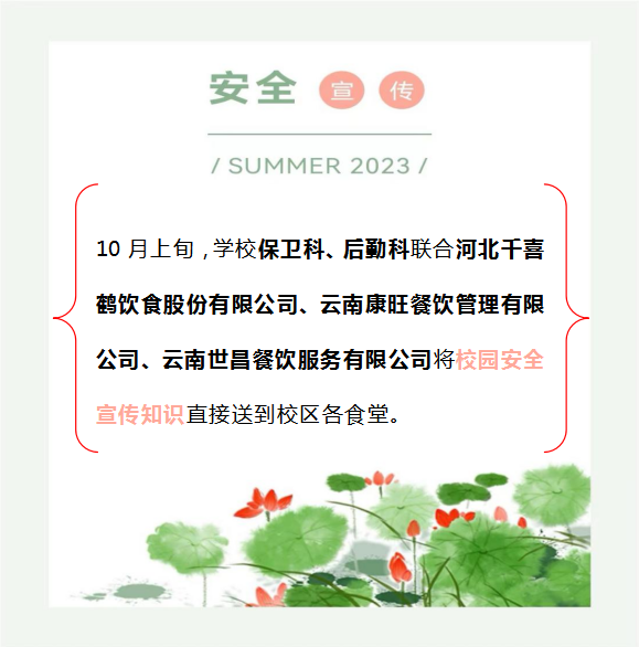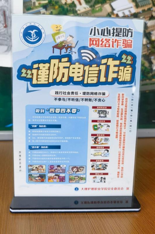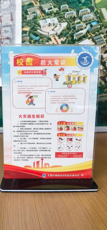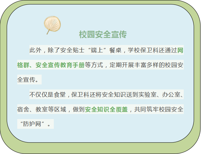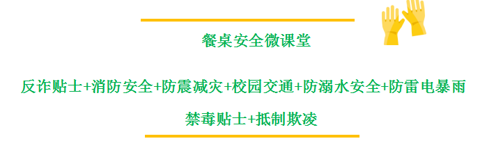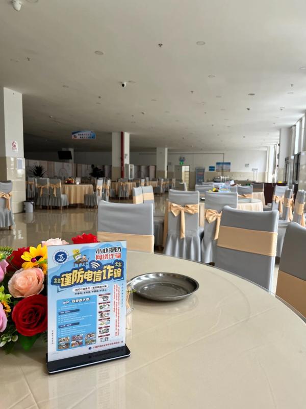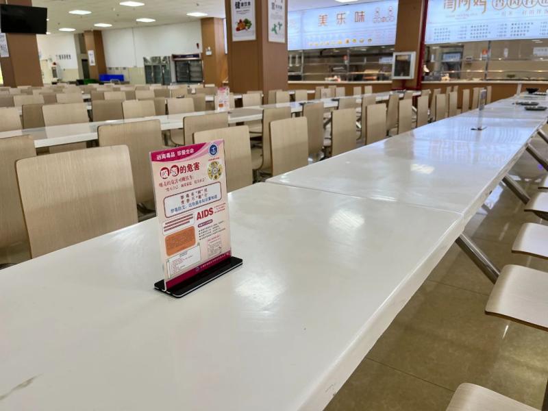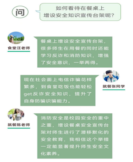 学校保卫科将安全宣传知识做成台架放在食堂餐桌上,并将定期更新安全知识,内容通俗易懂,也很“下饭”。