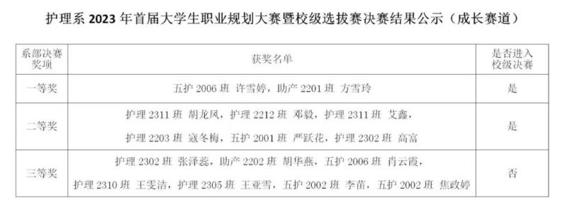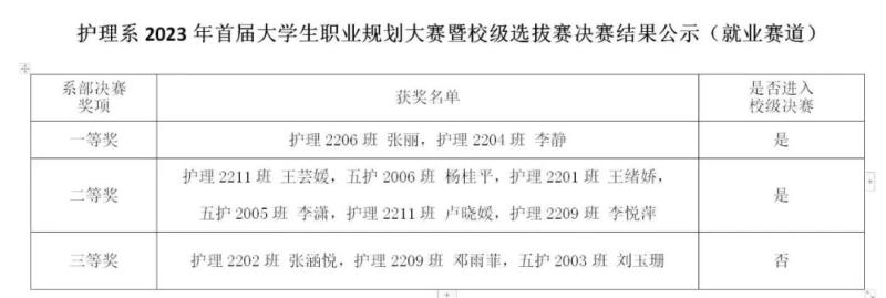 为进一步加强护理系学生职业生涯规划意识和就业指导,促进我系毕业生更高质量充分就业,按照学校《关于举办BB贝博艾弗森官方网站首届大学生职业规划大赛的通知》的相关精神和要求,经过班级选拔推荐、系部初赛、系部复赛、系部线下决赛,最终获得成长赛道和就业赛道一、二等奖共计16名同学被推选参加校级决赛。