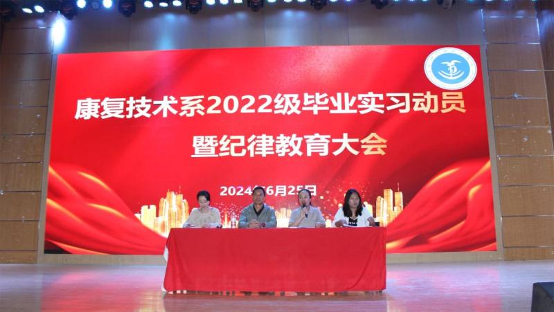 6月25日下午,BB贝博艾弗森官方网站康复技术系在第一报告厅召开了2022级毕业实习动员暨纪律教育大会,举行第七届学生康复技能大赛颁奖仪式,进一步加强对实习学生的管理和安全教育,正风肃纪,表彰先进。学校党政领导出席颁奖仪式,康复技术系2022级全体师生参加会议。会议由康复技术系副主任李波主持。