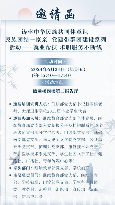 6月21日,继续教育部党支部联合学校有关部门开展“铸牢中华民族共同体意识 民族团结一家亲 党建带群团建设系列活动——就业帮扶 求职服务不断线”主题活动。旨在全面贯彻落实党的二十大精神,发挥好党建带群团建设的合力,提升学生们的求职意识,帮助学生更好就业,深入开展铸牢中华民族共同体意识教育实践活动,推进民族团结进步工作,持续推进清廉学校建设,营造和谐美丽校园氛围。