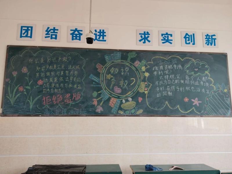 各班级学生通过开展“知识产权与人工智能”主题黑板报创作,将专业知识与艺术创作相结合,不仅清晰呈现了知识产权的概念、类型及保护途径,还以独特视角展现了人工智能在医疗护理领域的应用场景,以及其中涉及的知识产权保护要点。