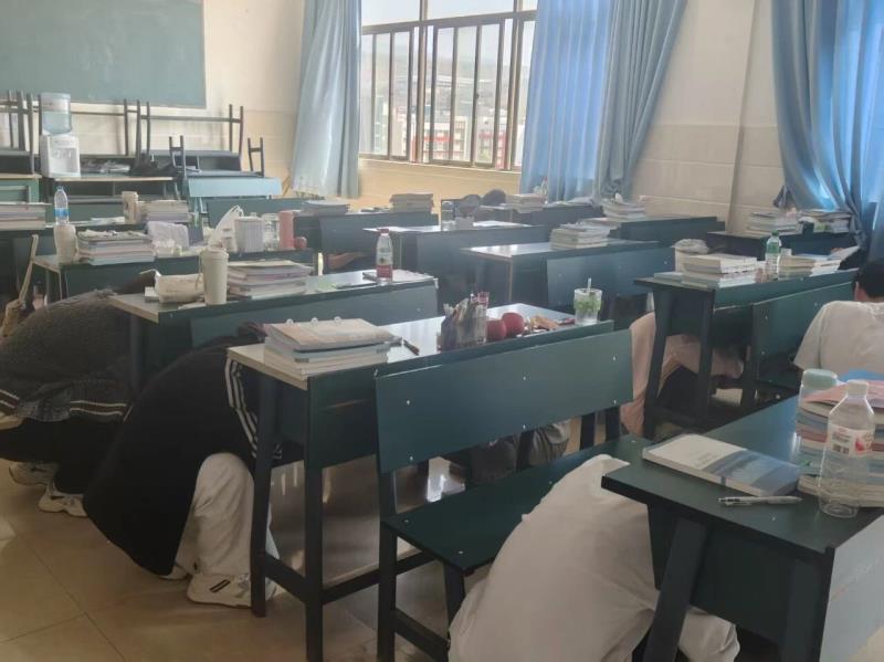 第二阶段是地震疏散演练,地震演练分三个环节启动,第一环节连续警报响起,全体师生迅速反应,躲在课桌下,做好就地避险动作,整个过程紧张有序、动作规范。第二环节断断续续的警报响起,疏散信号发出后,各班学生从前后门有序离开教室,双手抱头按照指定路线迅速撤离,在疏散过程中全体师生严格遵守纪律,不推搡、不喧哗、不逆行,整个过程紧张有序。第三环节到达集结点后各班迅速清点人数并上报。