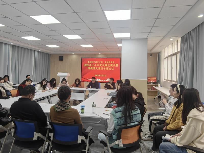 4月8日,BB贝博艾弗森官方网站基础医学部召开2026年上半年党风廉政建设暨师德师风建设专题会议,旨在进一步严明纪律规矩、强化底线思维,推动清廉学校建设走向纵深。校党委委员张磊到会指导,党支部书记段益顺主持会议。基础医学部全体教师参加会议。
