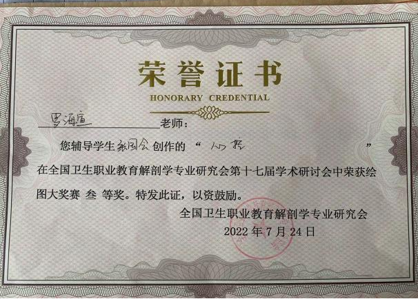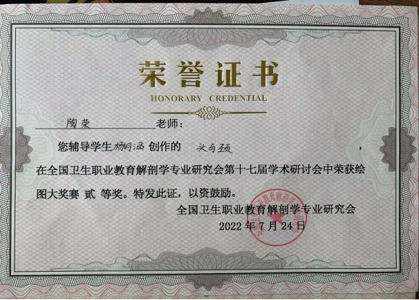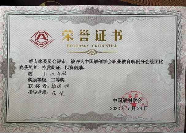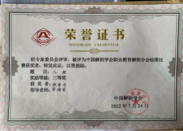 在中国解剖学会职业教育解剖学分会第一届学术年会绘图比赛、全国卫生职业教育解剖学专业研究会第十七届(2022年)学术研讨会暨第四届“中博杯”解剖学专业系列大赛中,护理2013班杨钥涵同学绘制的《头与颈》获二等奖(指导老师:陶荣)、护理2013班张国会同学绘制的《心控》获三等奖(指导老师:罗海宣)。