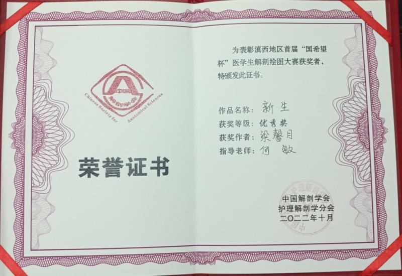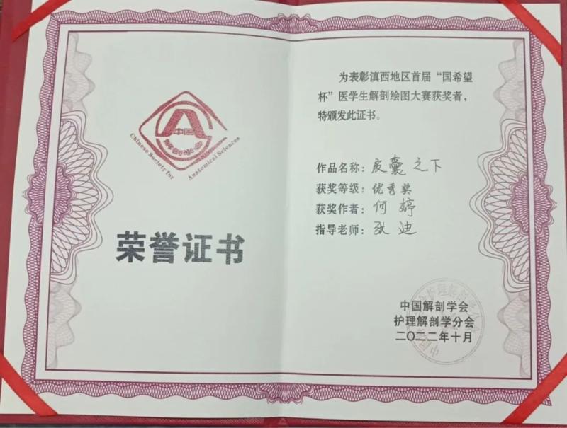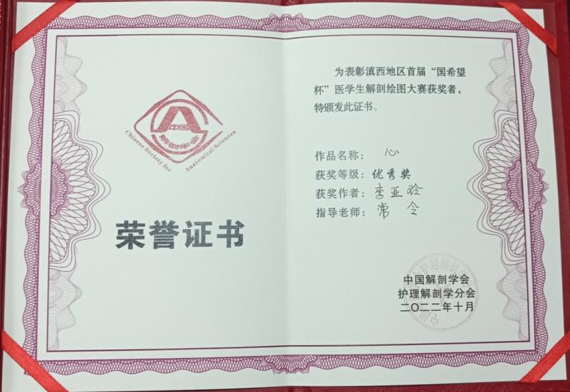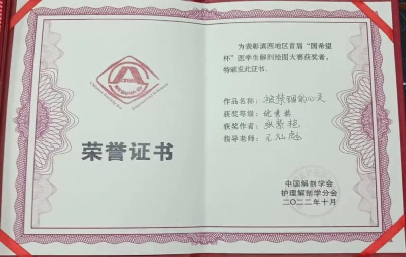 在中国解剖学会护理解剖学分会举办的滇西地区首届“国希望杯”医学生解剖绘图大赛中,护理2003班李亚玲同学绘制的《心》获优秀奖(指导老师:常令)、眼视光2001班和婷同学绘制的《皮囊之下》获优秀奖(指导老师:张迪)、护理2010班张紫艳同学绘制的《被禁锢的心灵》获优秀奖(指导老师:王灿彪)、五年制助产1801班梁馨月同学绘制的《新生》获优秀奖(指导老师:何敏)。