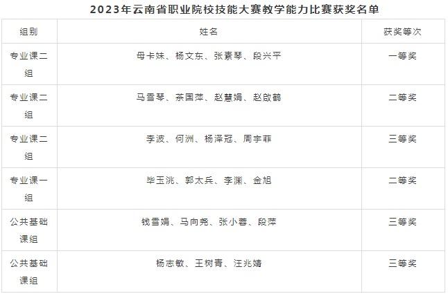 7月15日,由云南省教育厅主办,云南机电职业技术学院承办的“2023年云南省职业院校技能大赛教学能力高职组比赛”在昆明顺利落下帷幕。贝博官网参赛的6个项目全部获奖,荣获1个一等奖、2个二等奖和3个三等奖。