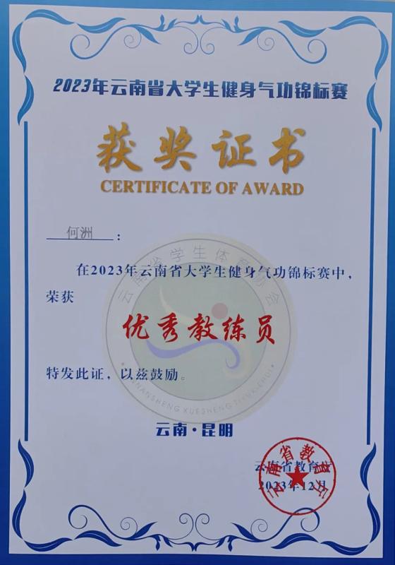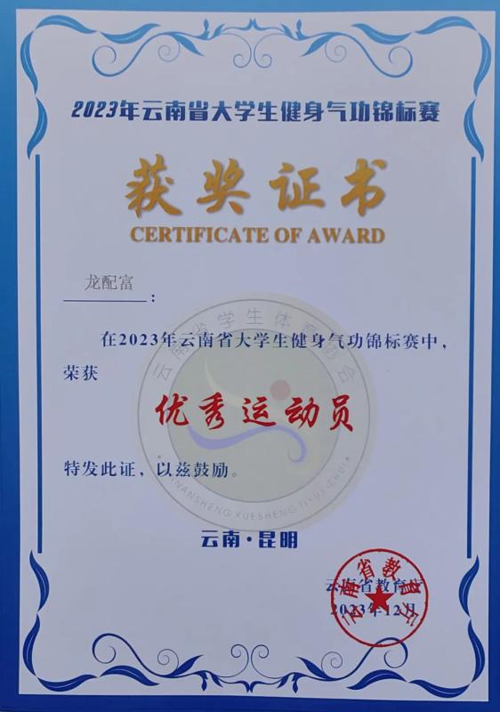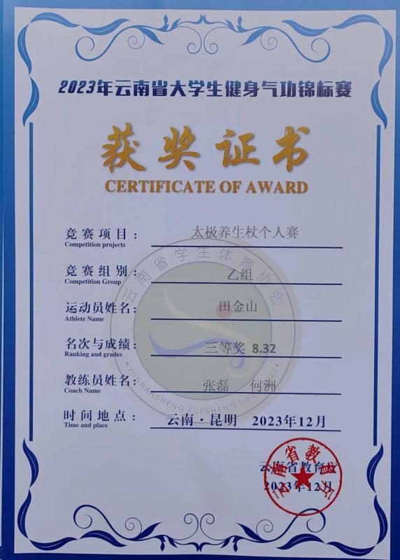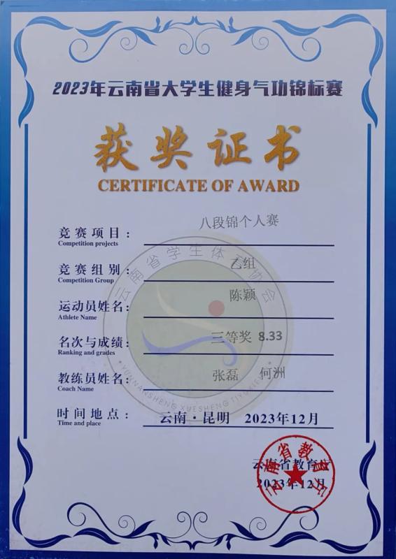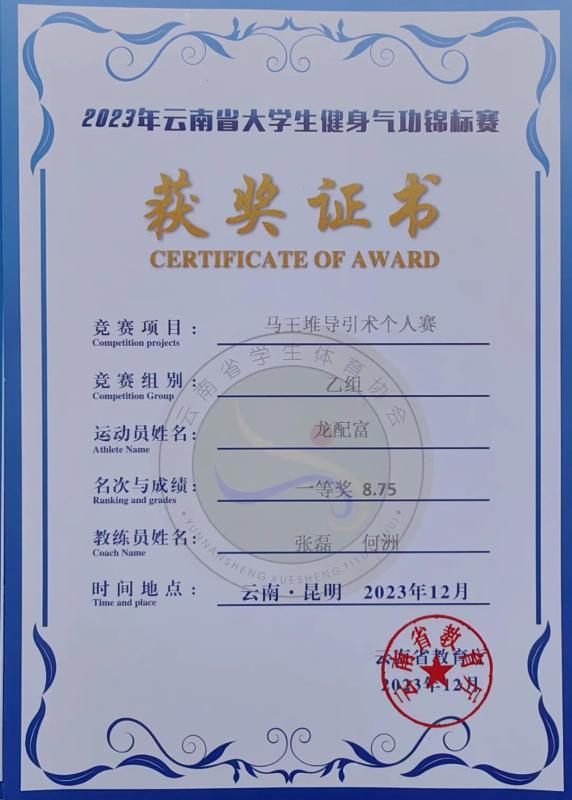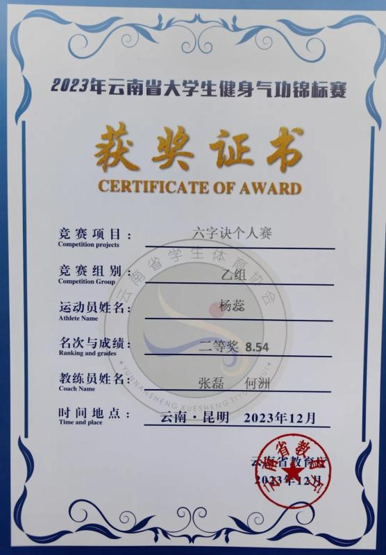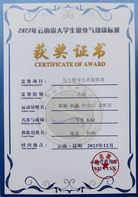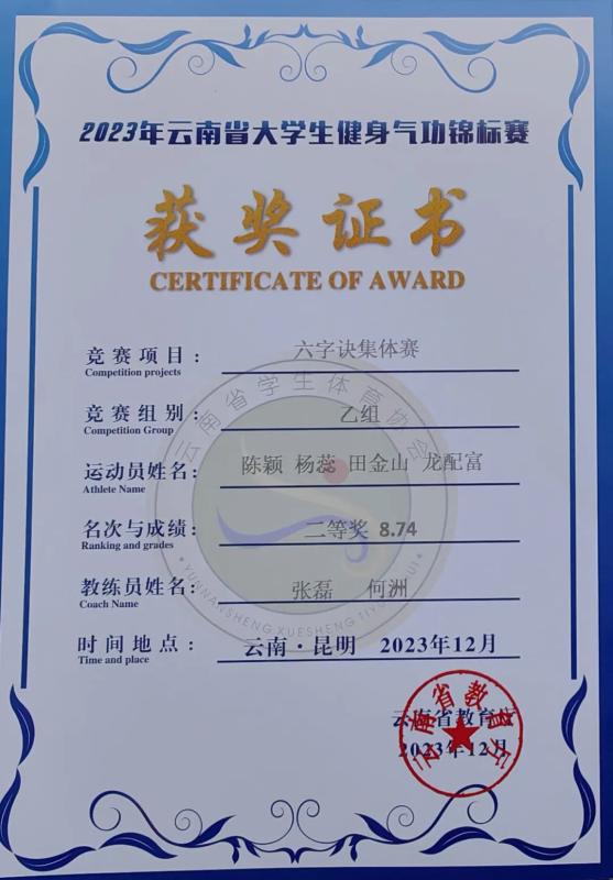 12月23日至25日,2023年云南省大学生健身气功锦标赛在昆明文理学院(杨林校区)举行,贝博官网康复技术系大学生奋勇拼搏,荣获集体项目六字诀乙组二等奖、马王堆导引术乙组二等奖;个人项目马王堆导引术乙组一等奖、六字诀乙组二等奖、八段锦乙组三等奖、太极养生杖三等奖;优秀教练员奖1人和优秀运动员1人。