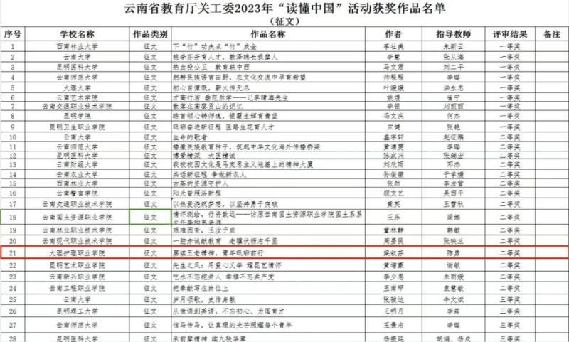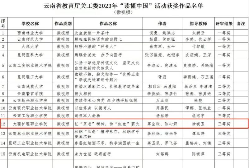 近日,云南省教育厅关心下一代工作委员会公布了2023年“读懂中国”活动作品评审结果,贝博官网征文《赓续五老精神,青年砥砺前行》获二等奖(梁叙芬同学撰写、陈勇老师指导);贝博官网微视频《忆“五老”精神,传“红色”薪火》获三等奖(高宝珠、陈心妍、尹程鹏,李金彩,李韩同学制作,徐晓玉老师指导).具体评审结果如下: