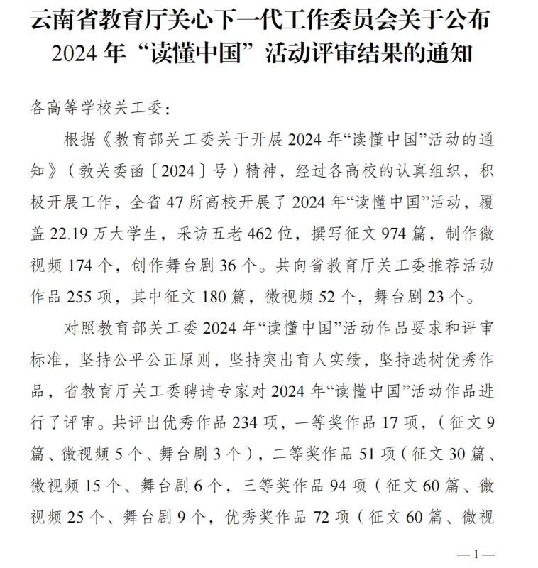云南省教育厅关工委2024年读懂中国活动微视频获奖名单