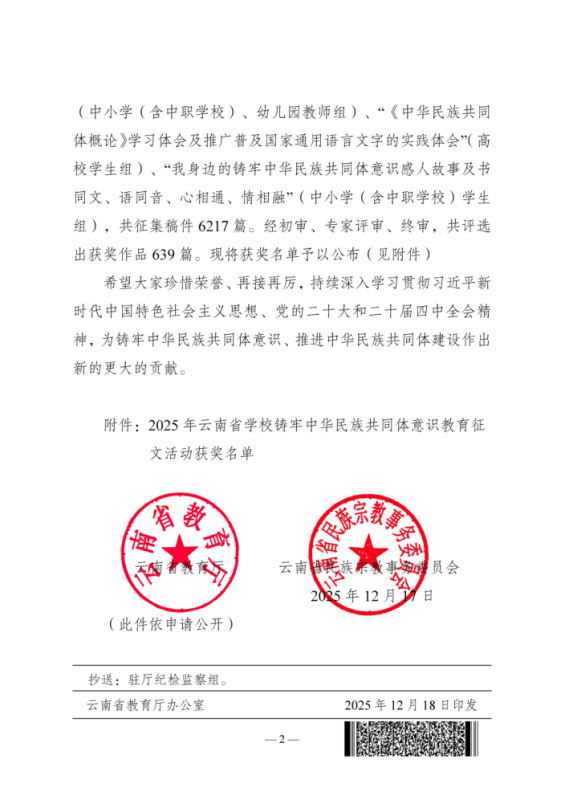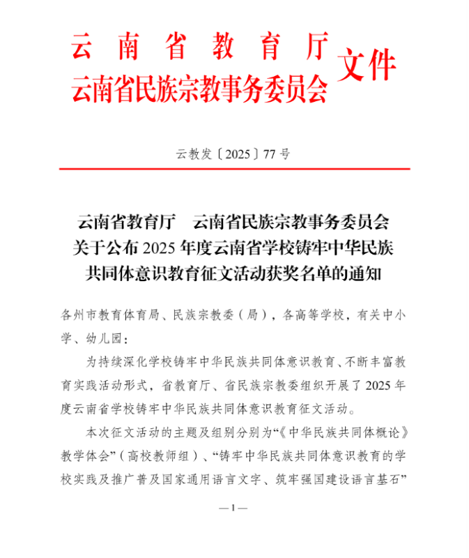 近日,2025年云南省铸牢中华民族共同体意识教育征文评选结果正式揭晓,BB贝博艾弗森官方网站马克思主义学院教师柴薇撰写的《从茶马古道到民族走廊:一位云南教师眼中的中华民族共同体意识的影响及引导策略》凭借鲜明的主题立意、扎实的理论功底与生动的实践思考,从高校教师组576篇参赛作品中脱颖而出,最终在 59 篇获奖作品中斩获二等奖!