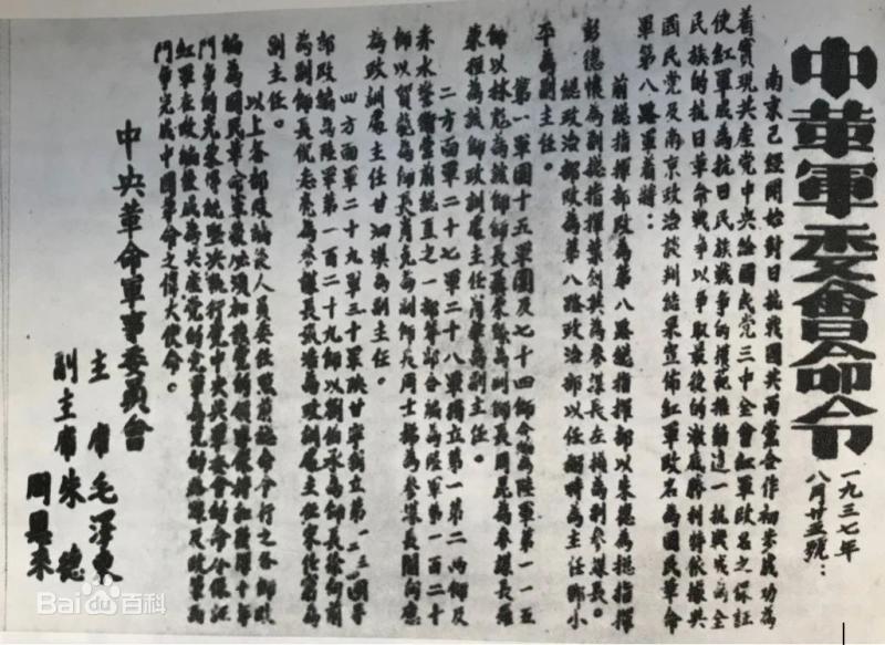825日,中共中央军委发布了改红军为八路军的命令,原文如下:南京已经开始对日抗战,国共两党合作初步成功。为着实现中共中央给国民党三中全会红军改名之保证,推动这一抗战成为全民族的抗日革命战争,我们宣布红军改名为国民革命军第八路军,着将:前总指挥部改为第八路总指挥部,以朱德为总指挥,彭德怀为副总指挥,叶剑英为参谋长,左权为副参谋长,总政治部改为第八路军政治部,以任弼时为主任,邓小平为副主任。[4]  第一军团、十五军团及七十四师合编为陆军第一一五师,以林彪为该师师长,聂荣臻为副师长;二方面军二十七军、二十八军、独立第一、第二两师及赤水警卫营、前总直之一部等部,合编为陆军第一二〇师,以贺龙为师长,肖克为副师长;四方面军二十九军、三十军、陕甘宁独立第一、第二、第三、第四团等部,改编为陆军第一二九师,以刘伯承为师长,徐向前为副师长,以上各部改编后,人员委任照前总命令行之。各师改编为国民革命军后,必须加强党的领导,保持和发挥十年斗争的光荣传统,坚决执行党中央与军委会的命令,保证红军在改编后成为共产党领导的军队,为党的路线及政策而斗争,完成中国革命之伟大使命。