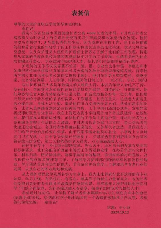 实习学生们的用心付出,让每一位老人和家属深受感动。近日,一位老人家属特意来到实习单位,对老年保健与管理专业的学生们表达了由衷的感谢,真诚的送上了感谢信。家属表示,学生们的细心照顾和关爱让他们的亲人在养老院里感受到了家的温暖,他们对学生们的专业能力和敬业精神深感钦佩!