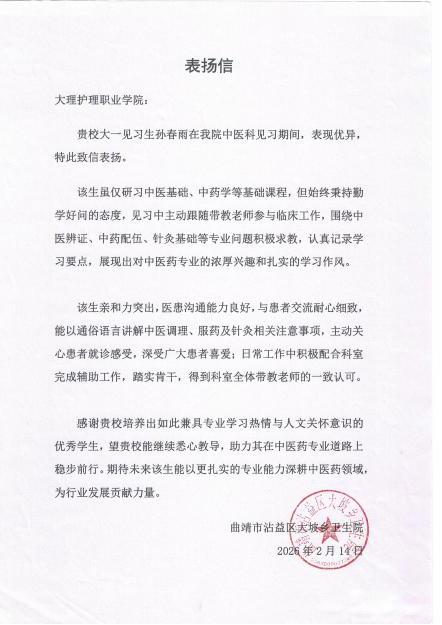近日,BB贝博艾弗森官方网站收到一封来自曲靖市沾益区大坡乡卫生院的表扬信,信中对康复技术系中医康复技术2502班学生孙春雨,在2026年寒假大学生“返家乡”社会实践暨大学生实习“扬帆计划”活动中的优异表现“点赞”。