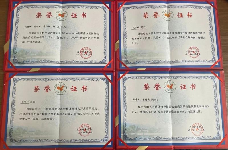 其中,我院张晓红老师撰写的论文《倍半萜内酯化合物Santamarin对荷瘤小鼠抗氧化及免疫功能的影响》在大理州医学会2019-2020年度优秀论文评选活动荣获二等奖;邹秀月、蔡德周老师撰写的论文《噬菌体治疗细菌性疾病的研究进展及发展方向》荣获三等奖;李怀宇老师撰写的论文《三七多糖的分离纯化及其对人牙周膜干细胞、小鼠成骨细胞体外增殖活性的影响》荣获三等奖;赵玉群老师撰写的《高职护生临床综合能力相关技能培养与护理教学改革探索》获得鼓励奖。