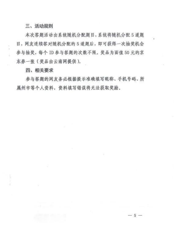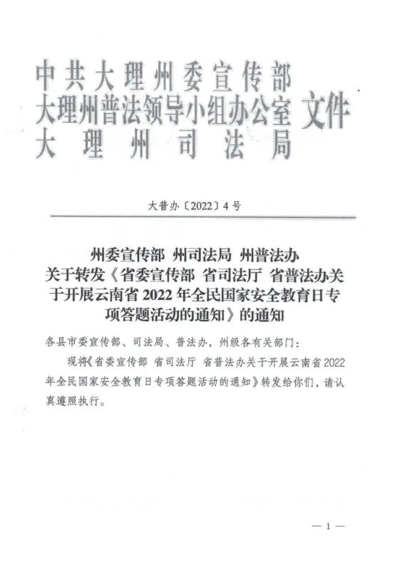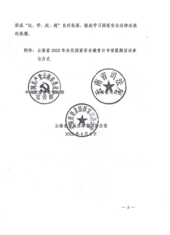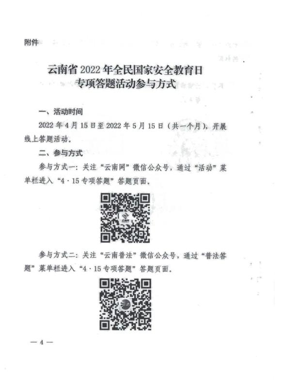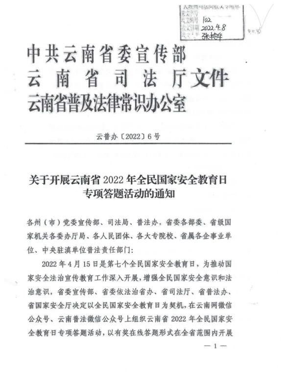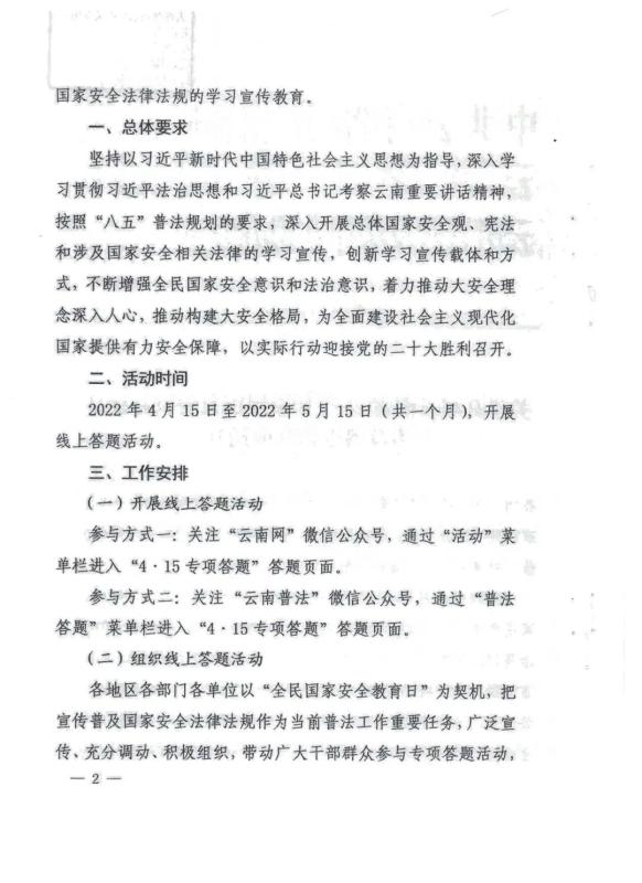 经学校研究决定,根据省、州《关于开展云南省2022年全民国家安全教育日专项答题活动的通知》要求,号召全校师生关注“云南网”或“云南普法”微信公众号,积极参与专项答题活动,认真学习国家安全法律法规。