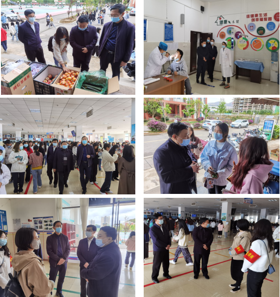 在学校党委书记王荣富、院长蔡德周的陪同调研,张副厅长深入学校门卫保安室、学生宿舍、超市、食堂、疫情防控物资存储室、校医室、临时留观室等重点场所检查疫情防控落实情况。听取了蔡院长就学校健康监测、环境清洁、物资储备、通风消毒、错峰就餐及校园活动、学生心理疏导、“一校一策”等疫情防控工作的整体情况汇报。每到一处,他都与师生、医务工作人员、后勤服务人员等进行亲切交流,了解学校后勤保障和师生的真实诉求,并代表省教育厅向全校师生员工表示节日慰问,鼓励大家坚定信心、共克时艰,坚决守住校园疫情防控底线。