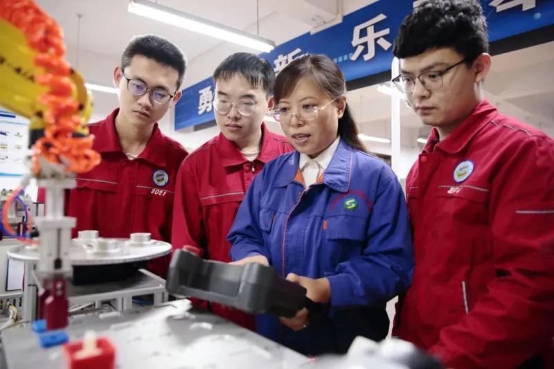 于是,李粉霞率先寻求校企合作之路,与苏州勤美达精密机械有限公司连续九年开展“工学交替,顶岗实习”人才培养模式,实现了“校企双主体”“过程四共同”(即共同制订人才培养方案、共同组织实施培养过程、共同进行质量监控、共同安排就业) “效果五共赢”(学校、企业、教师、学生、家长);率先开展“理实一体化”教学模式改革,提炼并归纳大赛赛项、企业生产项目,开发赛训融合课程;推行“三融合”项目化课程教学改革,建设实境化、企业化、生产化的校内实训工厂,推行现场教学与虚拟仿真相结合、课堂教学与课外活动相结合,知识教学与能力培育相结合的“三结合”教学模式;率先开展“社团传、导师帮、师傅带、大赛练”的传、帮、带、练四级培优工程,更好地实现了“技能为本,立德树人”的价值目标;率先为本科院校、赞比亚等海外学员开展师资培训,承担国培项目;率先成立数控技能大师工作室,淮海集团副总工程师“老匠人”李勇怀、中国运载火箭研究院首席技能专家韩利萍等11位技术精英成为驻校大师,共同培养创新拔尖人才,共同开展技术攻关、实施技术改造;率先在全省开展工业机器人技术专业,申报获批教育部工业机器人技术应用人才培养中心,并挂牌成为ABB工业机器人技能认证中心,确立了全省领先地位。