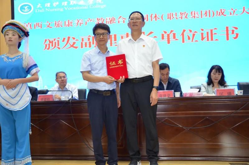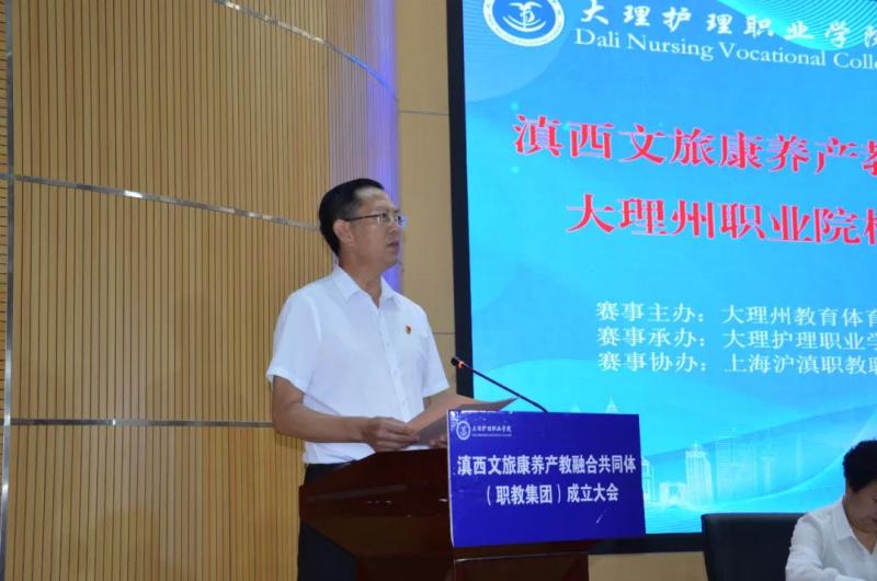 大理州人民政府副秘书长苏志敏,州教体局局长张建荣,大理大学副校长廖望科,华东师范大学教授、职业教育与成人教育研究所党委书记匡瑛,中国太平洋保险养老产业投资管理有限责任公司总监、云南省保险学会会长尹建宏,大理州人社局副局长李恒、卫健委副主任王敏、民政局副局长晁子清、总工会副主席郑斌、文旅局调研员范光明,BB贝博艾弗森官方网站党委书记廖惠群、院长蔡德周,169家共同体(职教集团)单位代表和学校师生代表参加成立大会。