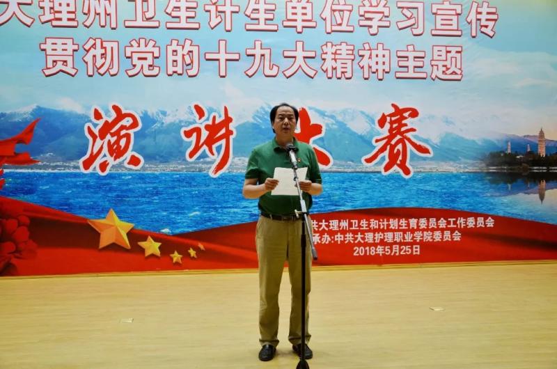 2018年5月25日下午,根据州卫计委党工委的安排部署,由大理州卫生和计划生育委员会主办,BB贝博艾弗森官方网站承办的大理州卫生计生单位学习宣传贯彻党的十九大精神主题演讲大赛在BB贝博艾弗森官方网站举行。大理州卫计委党工委书记、党组书记师尚琨出席并讲话,州卫计委、州级各卫生计生单位领导、部分职工代表、BB贝博艾弗森官方网站师生代表共240余人观看了演讲比赛。