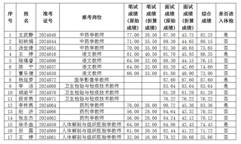 根据《大理州教育体育系统2025年度“校园招聘”工作人员公告》要求,现已完成了资格审查、笔试、面试等相关工作环节,现将参加面试人员的综合成绩及进入体检人员名单公示如下: