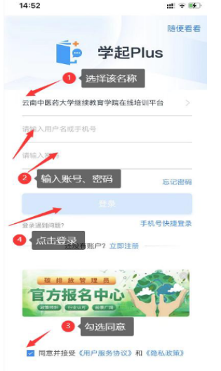 1、下载“学起plus”软件,登录APP。账号和密码均为个人报名时的手机号。