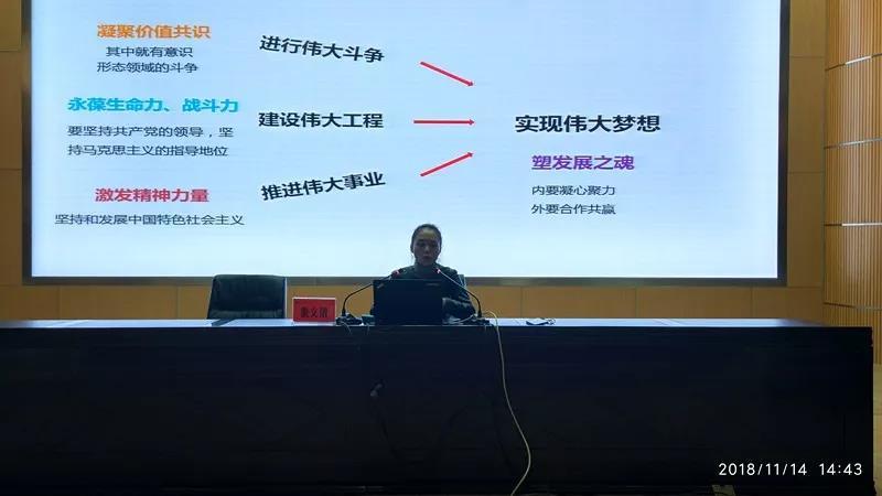 董老师以《强意识形态建设、塑国家发展之魂》为题,从意识形态工作是一项极端重要的工作、新时代意识形态工作的新情况和新问题、习近平总书记意识形态理论的基本要求等三大方面,运用了大量丰富详实的资料,为大家作了一场精彩、生动的专题报告。