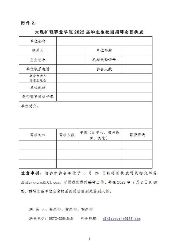 2.请按附件2认真填写的《BB贝博艾弗森官方网站2022届毕业生招聘单位回执表》并于2022年6月26日前将回执以电子邮件形式发送至dlhlzyxyzjc@163.com,以便我们安排展位。