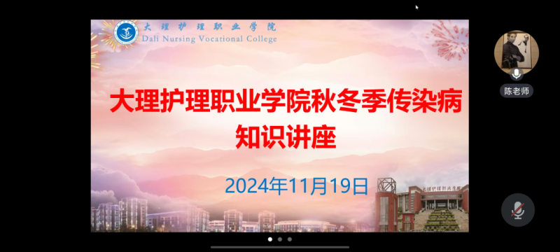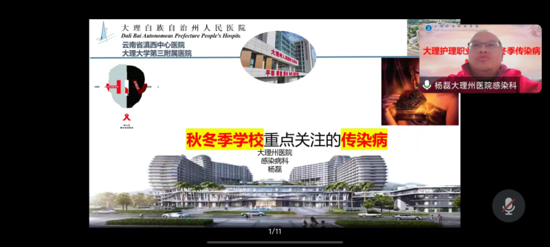 11月19日,学校邀请大理州人民医院感染科专家杨磊副主任医师通过视频讲座的形式,为全校3600余名师生开展了一次秋冬季常见传染病预防知识讲座。讲座由学生科科长陈勇主持。
