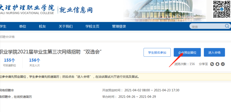 第二步(定展审核): 登录网络招聘会平台,点击“企业预定展位”,待审核通过,参加招聘。