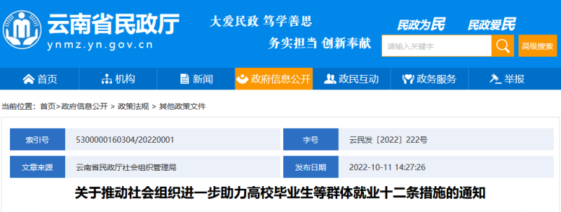 为深入贯彻党中央、国务院和省委、省政府关于做好高校毕业生就业创业工作的决策部署,推动落实民政部《“十四五”社会组织发展规划》(民发〔2021〕78号)、《民政部 教育部 人力资源保障部关于推动社会组织进一步助力高校毕业生等群体就业工作的通知》(民发〔2022〕57号)、《云南省人民政府办公厅关于进一步促进高校毕业生等青年就业创业若干政策措施的通知》(云政办发〔2022〕64号)等要求,切实发挥社会组织在促进高校毕业生等群体就业中的积极作用,结合我省实际,现将部署推动社会组织进一步助力高校毕业生等群体就业工作有关事项通知如下: