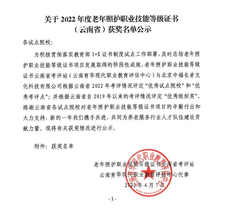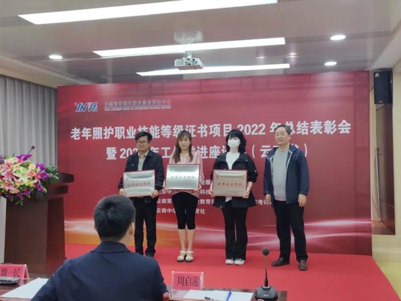 为进一步贯彻落实教育部“1+X”证书试点工作部署,及时总结老年照护职业技能等级证书项目发展取得的阶段性成效,老年照护职业技能等级证书项目2022年总结表彰会暨2023年工作推进会(云南省)2023年4月16日在昆明顺利召开,会上对先进集体进行了表彰。根据云南省2022年老年照护职业技能等级证书考评情况,BB贝博艾弗森官方网站被云南省考评站(云南育华现代职业教育评估中心)与北京中福长者文化科技有限公司综合评定为“优秀试点院校”称号。中国社会福利与养老服务协会、北京中福长者文化科技有限公司副总经理、首席技术官魏一民为学校颁奖授牌。
