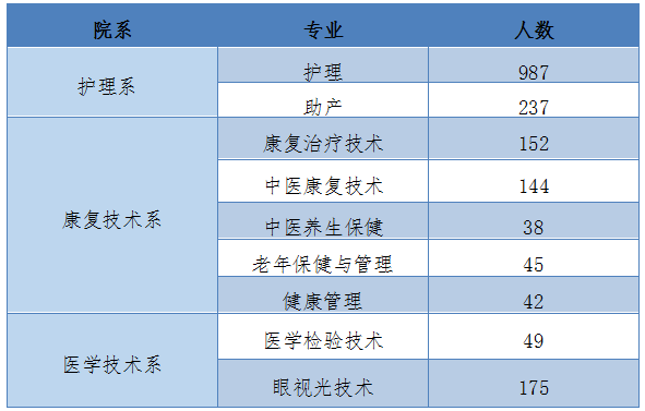 贝博官网2025届有护理、助产、医学检验技术、眼视光技术、健康管理、康复治疗技术、中医康复技术、中医养生保健及老年保健与管理9个专业高职专科毕业生共1869人,具体专业分布如下表: