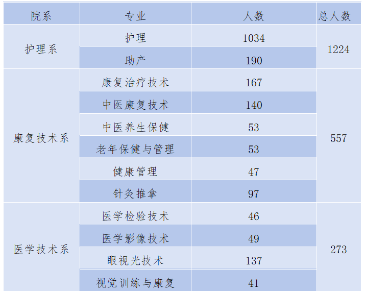 贝博官网2026届有护理、助产、医学检验技术、眼视光技术、健康管理、康复治疗技术、中医康复技术、中医养生保健及老年保健与管理、针灸推拿、视觉训练与康复、医学影像技术12个专业高职专科毕业生共2054人,具体专业分布如下表: